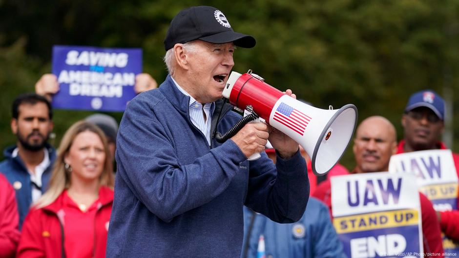US President Joe Biden flew to Detroit, Michigan, Tuesday where he joined members of the striking United Auto Workers’ (UAW) union on the picket line.